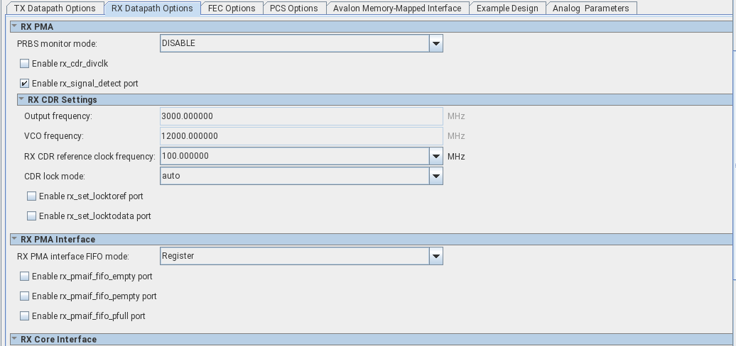 | Output frequency | Output | Specifies the non editable RX CDR output frequency initial value derived from the IP configuration. |