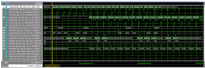 The following sample waveforms illustrates a simulation test run for 10GE MAC with PTP QuestaSim simulator.