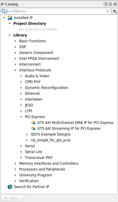 - Select Tools → IP Catalog to open the IP Catalog. Then, select GTS AXI Streaming IP for PCI Express (Library → Interface Protocols → PCI Express → GTS AXI Streaming IP for PCI Express), and then click Add.