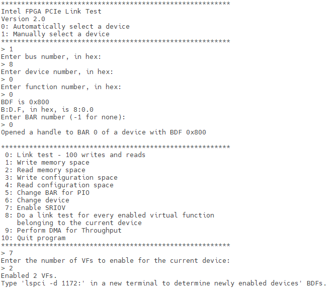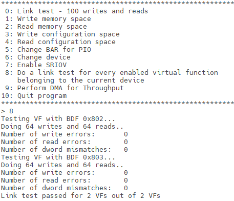- Enter Option 8 to initiate a link test for each enabled VF associated with the specified PF. The link test application performs 64 memory write operations, each writing a single DW of data, followed by corresponding read operations to verify data integrity. Upon completion, the application reports the number of VFs that failed the link test.