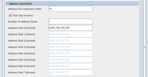Address ALU argument width | Specifies the width of the Address ALU. This affects the number of bits the Address ALU can change. Increasing this will allow wider ranges of address sweeping per command, but could degrade Fmax. The supported range for this parameter is from 1 to 44. Default value is 16. |