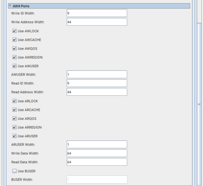 AWUSER Width | Specifies width of AWUSER port of the AXI4 bus. The supported range for this parameter is from 1 to 64. Default value is 8. |