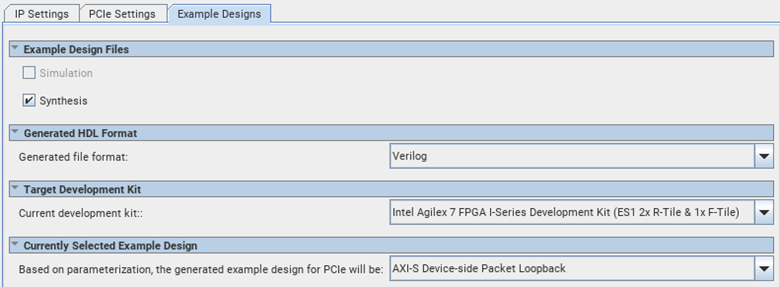Currently selected example design | AXI-S Device-side Packet Loopback | AXI-S Device-side Packet Loopback | Selects a design example. Only the AXI-S Device-side Packet Loopback design example is supported in the current release.