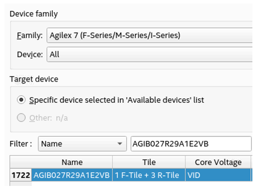 - Select Target device: Filter (Name): AGIB027R29A1E2VB.