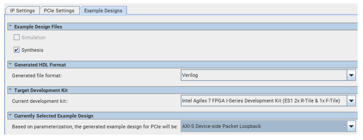 - Go to the Example Designs tab. Select Current Development Kit, Example Design and click Generate Example Design.