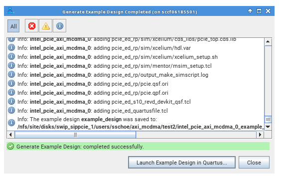 - After the design example generation is completed, click Launch Example Design in Quartus.
