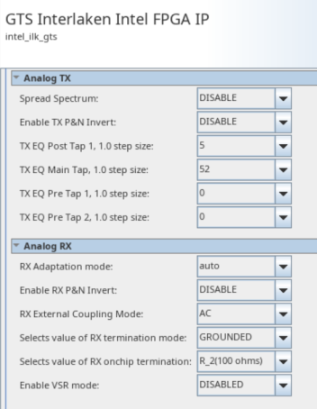 | RX EQ DFE Tap1 | 0 to 63 | Select the RX Equalization DFE Tap1 setting. Only available if you configure the RX Adaptation mode to manual. Not available when RX adaptation mode is set to auto. Default value is 0. |