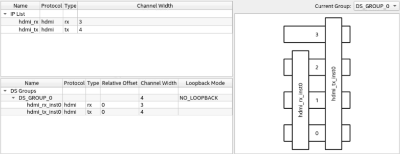 For Agilex™ 5 HDMI RX-TX Retransmit with integrated Transceiver with dual simplex (DS), the Transceiver IP instantiated inside the HDMI IP. The HDMI IP (RX and TX) are wrapped into a Dual Simplex Group. Both RX and TX transceiver are placed at the same channel.