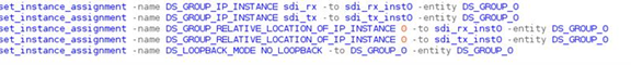 - Replace sdi_rx and sdi_tx module instantiation with the DS group generated. Set the input and output ports accordingly by referring to the sdi_tx and sdi_rx.