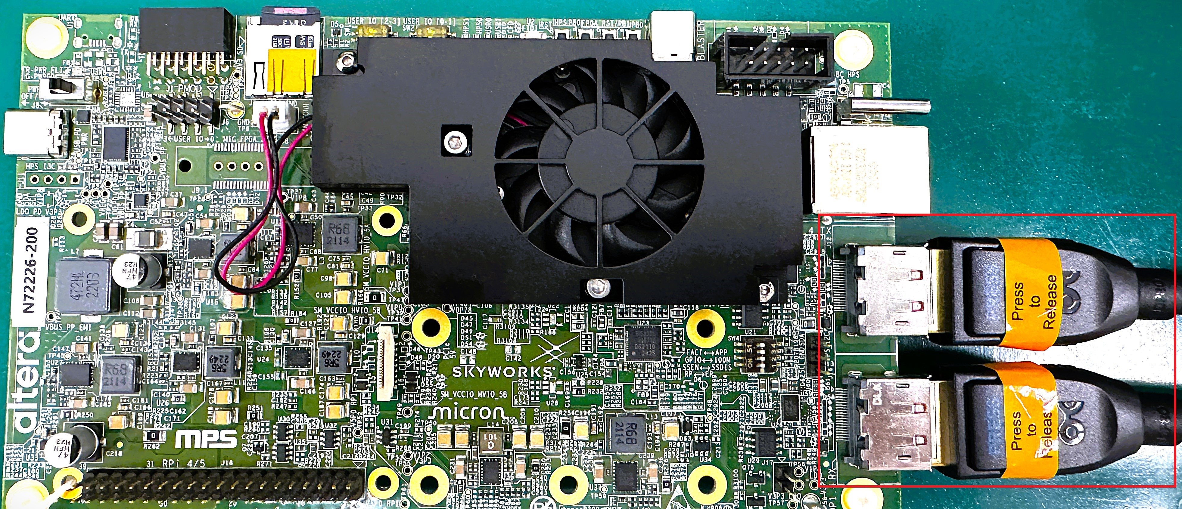 The following diagram shows the Agilex™ 3 Development Kit with the DisplayPort connectors located on the right-hand side.