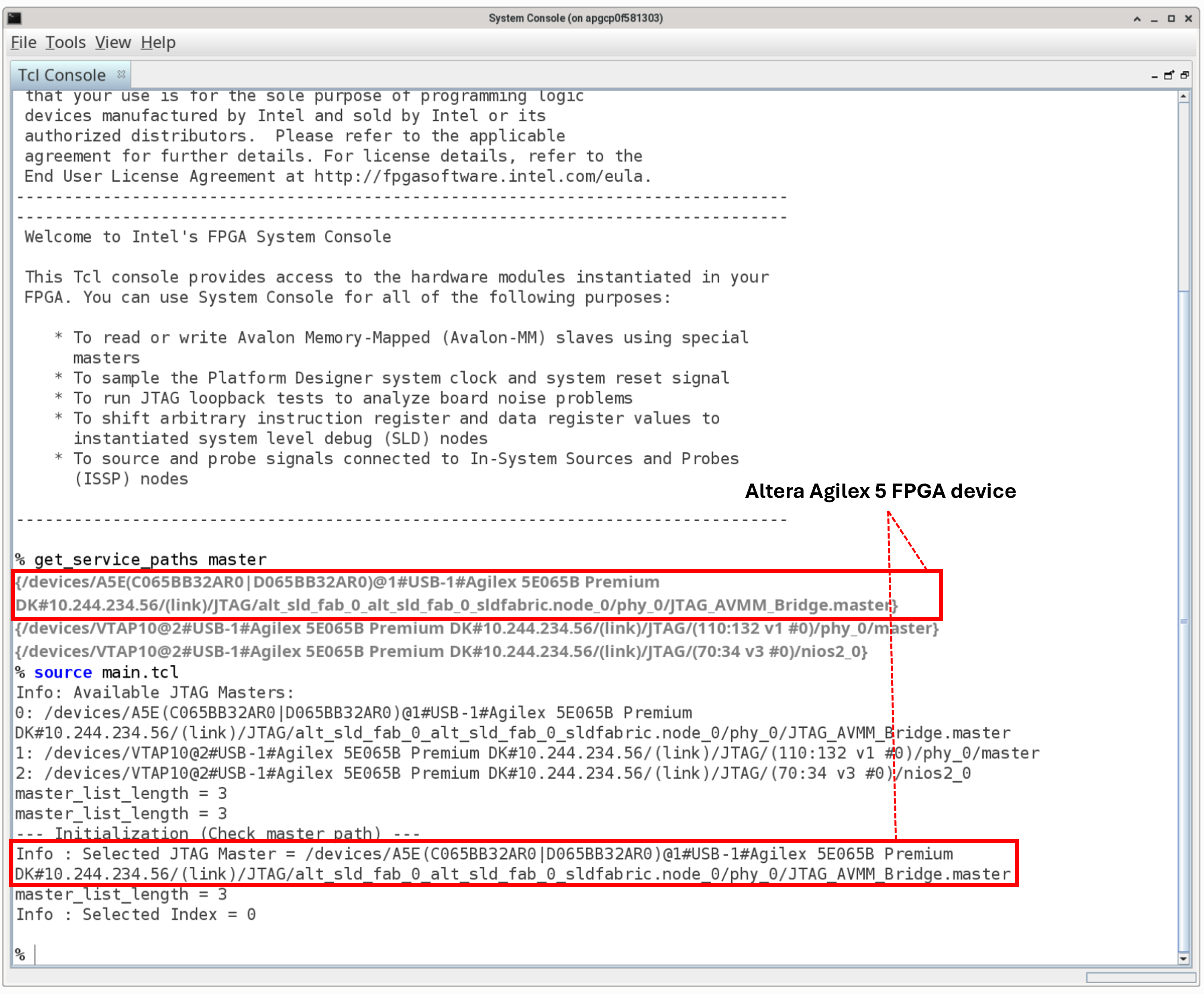 - In the TCL Console command prompt, type get_service_paths master to print a list of devices connected to your JTAG chain.