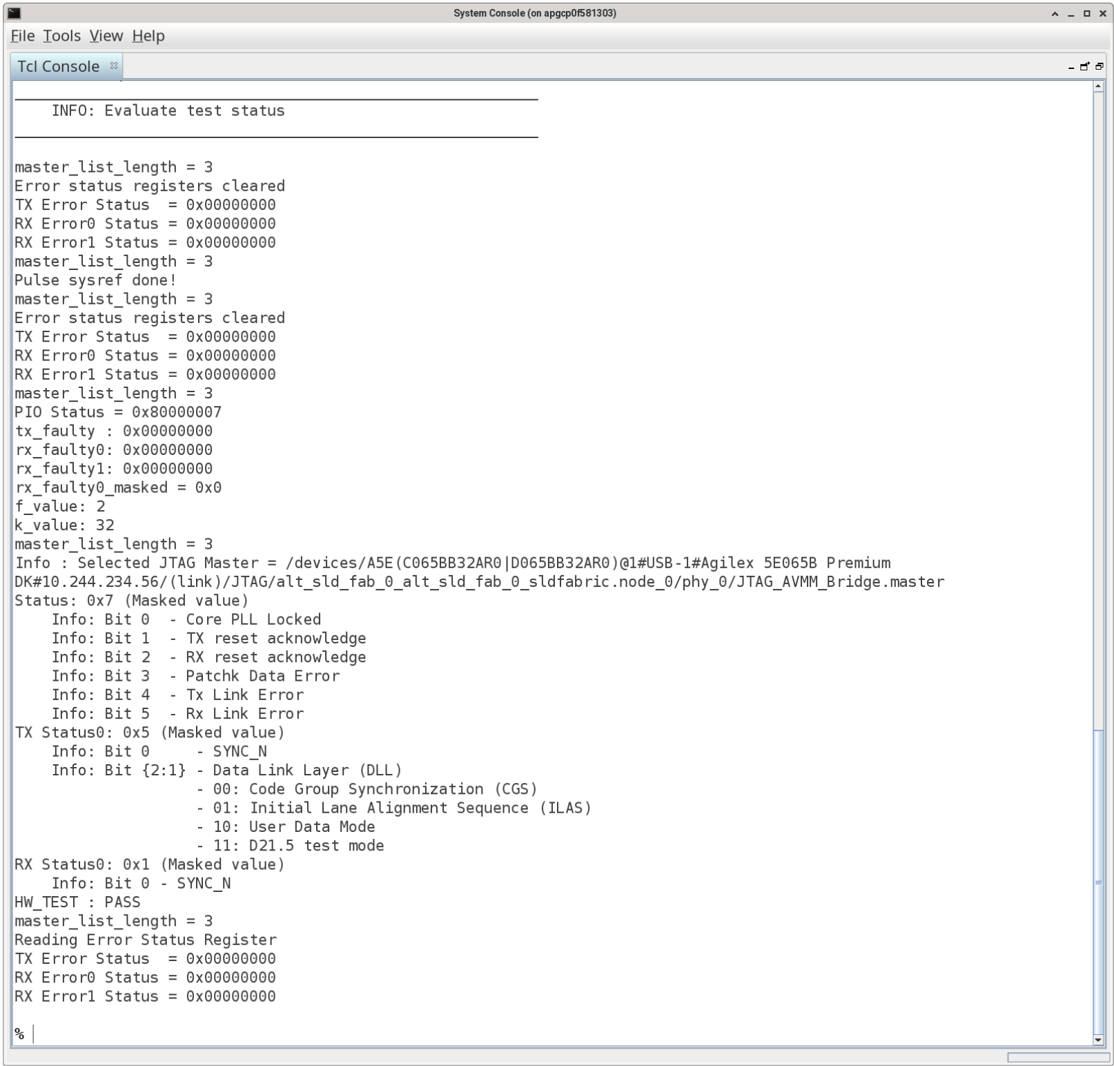 - In the TCL Console command prompt, navigate to the ed_synth/system_console/ directory and execute the main.tcl script (source main.tcl). Your TCL Console window should resemble the following figure.