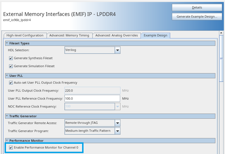 - When generating your design example, set the Enable Performance Monitor parameter to True. This includes the Performance Monitor FPGA IP, which allows you to measure performance on an AIX4 mainband interface.