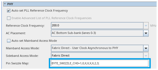 To achieve this swizzling, you must enter BYTE_SWIZZLE_CH0=1,0,X,X,X,X,2,3; in the Pin Swizzle Map in the PHY section in the External Memory Interfaces parameter editor.