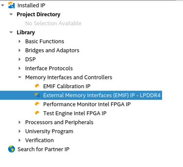 - In the IP Catalog window, select External Memory Interfaces IP. (If the IP Catalog window is not visible, select View > IP Catalog.)