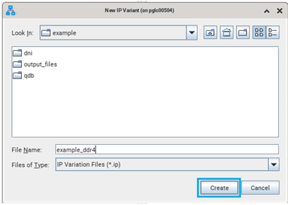 - In the IP Parameter Editor, provide an entity name for the EMIF IP (the name that you provide here becomes the file name for the IP) and specify a directory. Click Create.