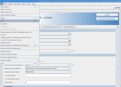 - Configure the EMIF IP and then click File > Save to save the current settings into the IP variation file (<instance_name>.ip).
