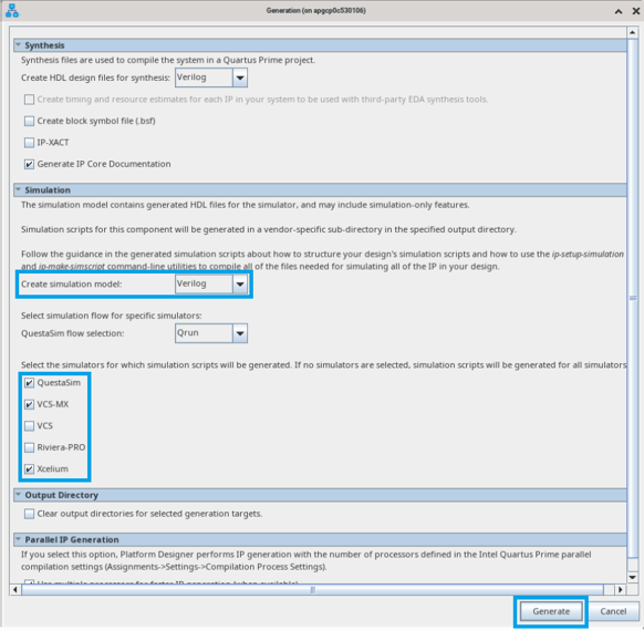 - The Create HDL design files for synthesis parameter is set by default to Verilog. Change the Create simulation model parameter from None to Verilog, and select the simulator that you want. The simulation design does not include the traffic generator, therefore you must create your own traffic generator.