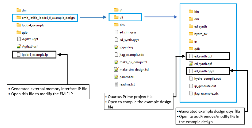 Note: For information on compiling the design example, refer to Compiling the EMIF Design Example .Figure 11. Generated Synthesizable Design Example File Structure