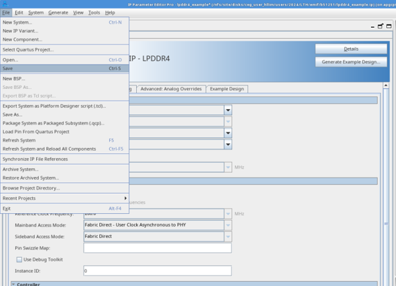 - If you are implementing a single interface example design, configure the EMIF IP and click File > Save to save the current settings into the IP variation file (<user instance name>.ip).