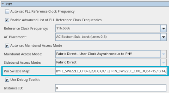 The Pin Swizzle Map allows you to specify the ordering of the physical connections of each DQ pin on the memory component to the FPGA. Incorrect information entered in the Pin Swizzle Map may cause calibration errors.