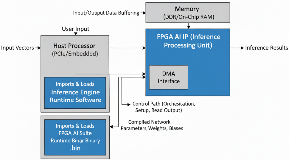 - Executes the Inference Engine runtime software (which imports and loads the compiled network parameters, weights, and biases contained in FPGA AI Suite runtime binary (.bin file)