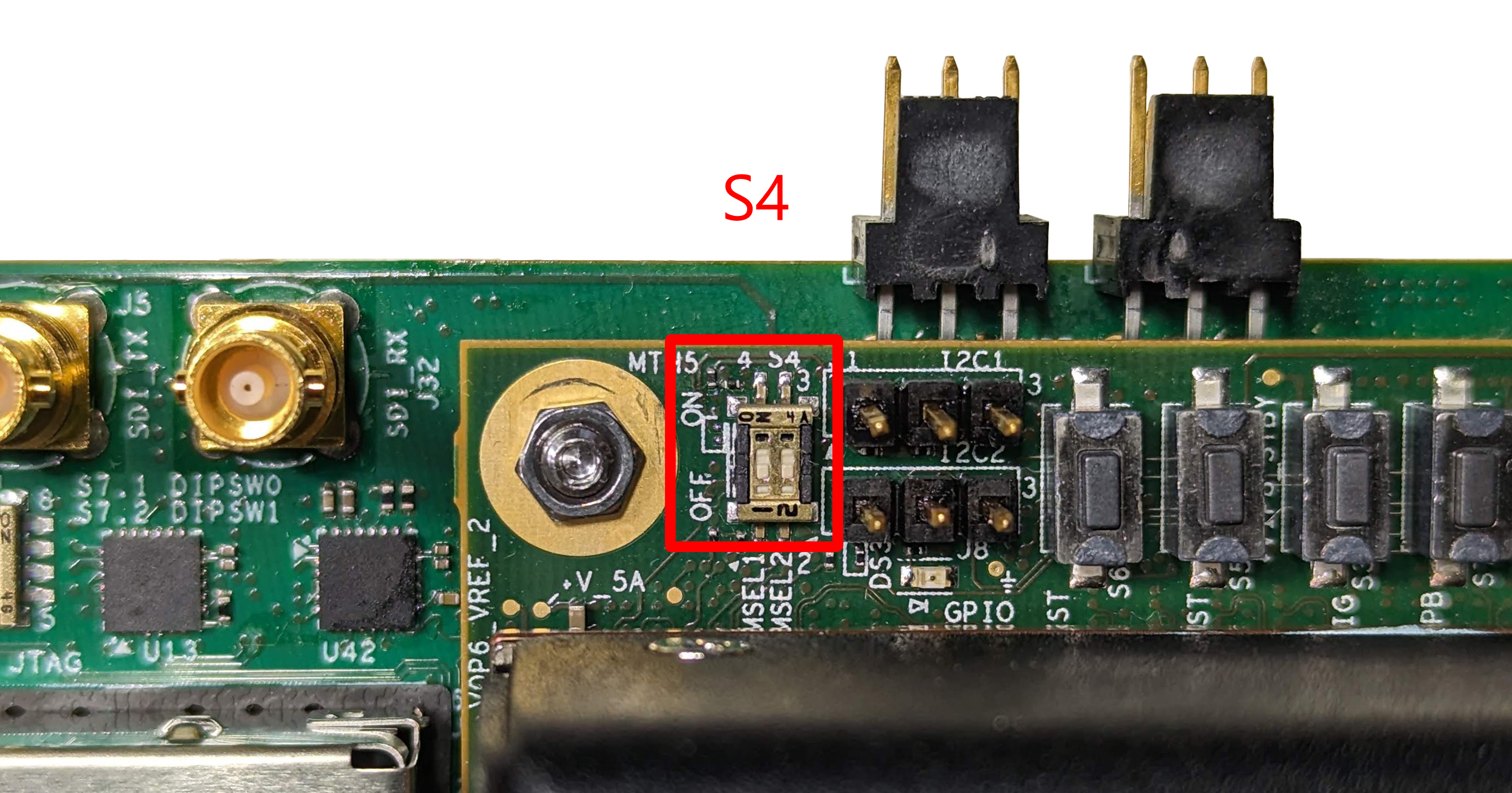 - Switch the board into JTAG mode by setting the S4[1:2] DIP switch to OFF/OFF: