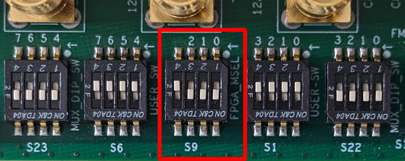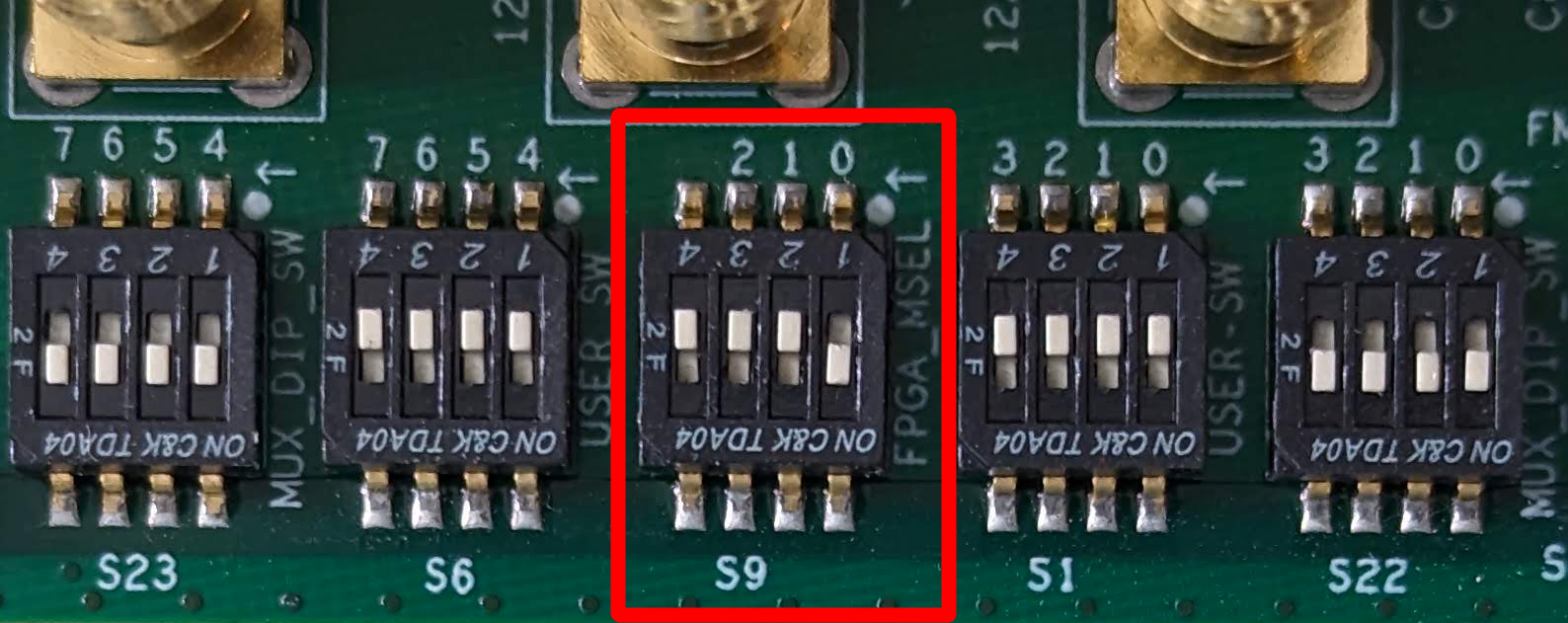 - Switch the board into JTAG mode by setting the S9[1:4] DIP switch to ON/ON/ON/OFF: