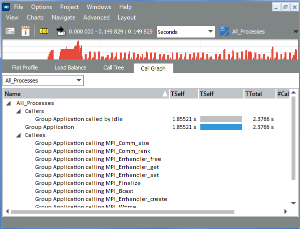 If your application uses a function in different contexts (for example, different algorithms use the function), you can observe which algorithm causes a function to consume more or less time. In the Call Graph, you can see which caller is responsible for most of the time spent in MPI: it is the function group Application (and not Forward, Adjoin, cg, or Smoother). If the call tree gets too big to navigate through, use the Call Graph to find places in the code that cause expensive calls.