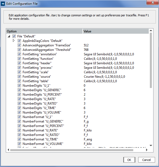 Generally, it is better to avoid moving options whose values are files or lists of files. For example, a cache file usually corresponds to a particular trace file, and moving a UserDefines Cachefile to another trace file or the default section would not make sense, unless the intent is to reuse that cache file with a different trace. On the other hand, you can drag and drop color definitions from trace to trace or to default (the latter will define that color for all trace files, unless they provide their own definition). Moving group definitions, however, requires more attention, since group ids in one trace might not make sense in another. To solve such issues, you can examine and edit values.