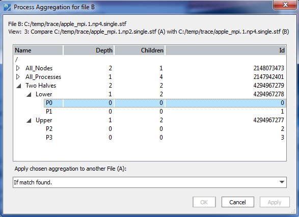 See a suitable Process Group for the comparison between a 2 and a 4 processor run in the Process Aggregation dialog box: