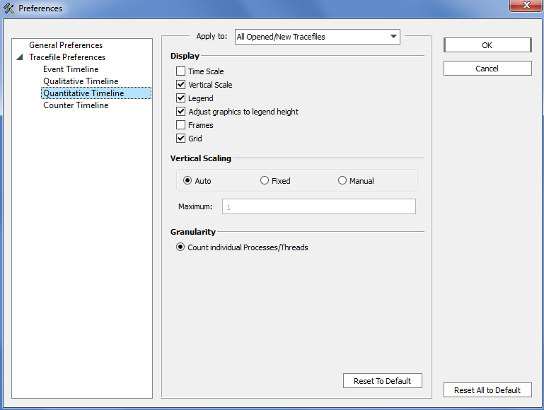 | Granularity | Define the level of detail you want the Quantitative Timeline to display. It may be either Individual processes/Threads or just top level entries of Group_All_Processes. |