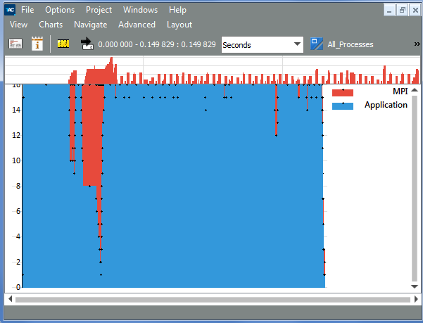 The Quantitative Timeline gives an overview of the parallel behavior of the application. It shows over time how many processes or threads are involved in which function. To open the Quantitative Timeline, go to Charts > Quantitative Timeline.