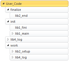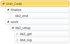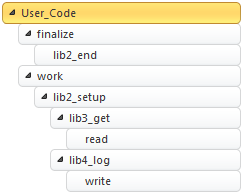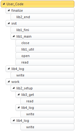In this section folding is illustrated by giving configurations that apply to the example above. The sample libraries.c program reproduces the same pattern. Its call tree looks as follows (calls are aggregated and sorted by name, therefore the order is not sequential):