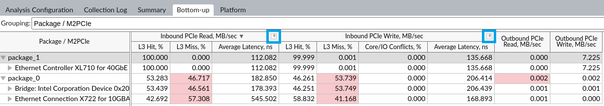 To see PCIe metrics, select the Package/M2PCIe grouping in the Grouping drop-down menu. This grouping breaks down the metrics by sockets and M2PCIe blocks that are named by PCIe devices that they serve. If M2PCIe manages more than one device, device names are given as a comma-separated list. Hover over a cell to see all devices.