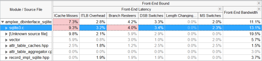Navigating to the ICache Misses metric also discovers the highest value for the sqlite3.c file:
