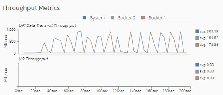 Observe the Throughput Metrics section. In this sample application, there are frequent spikes in cross-socket (UPI) traffic. These spikes correspond to remote memory accesses.