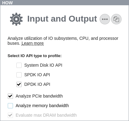 In the GUI, create a project, select the Input and Output analysis on the HOW pane, and enable the Analyze PCIe bandwidth option: