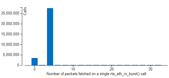 The fracture in the middle of the Outbound Write dependency looks interesting. This drop is a consequence of the Batch Histogram modification caused by processing of the increased packet rate. Before this point, the Batch Histogram has only two peaks - with batch sizes 0 and 4, and at this point a new peak of 8 appears (see the histograms below). According to the equations listed above, this increases an average batch size and leads to reducing the Outbound Write Bandwidth.