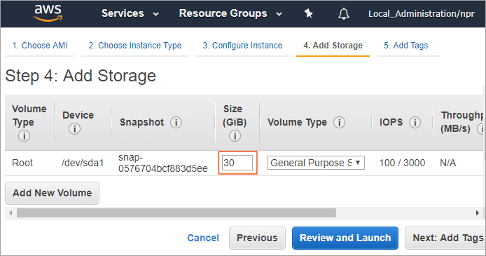 In Step 4: Add Storage, increase the size of the storage device and click Next: Add Tags.