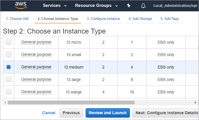 In Step 2: Choose an Instance Type, select an instance and click Next: Configure Instance Details.