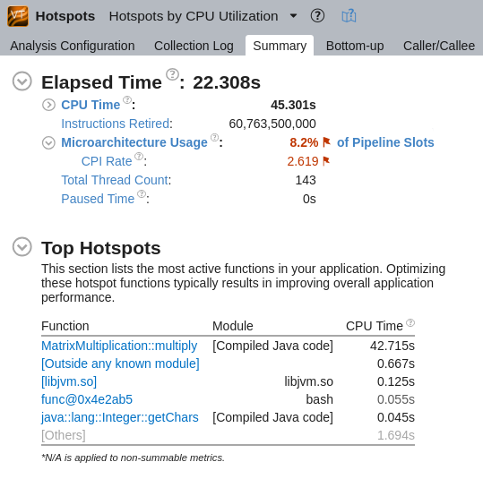 Singularity ubuntu.img:/local/vtune/matrix> /local/vtune/bin64/vtune -collect advanced-hotspots -- /local/vtune/jdk9.0.1-x64/bin/java -cp . MatrixMultiplication 2000 2000 2000 2000
