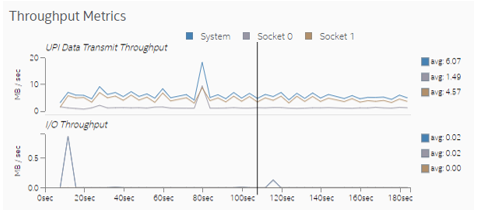 Observe the Throughput Metrics section. In this sample application, there are frequent spikes in cross-socket (UPI) traffic. These spikes correspond to remote memory accesses.