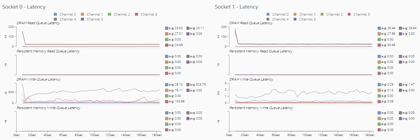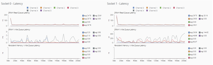 Setting thread CPU affinity and completing optimizations helped reduce memory access latencies significantly because more memory requests were directed to local memory. Observe in the Memory view that the scale of the DRAM Write Queue Latency graph changed from micro-seconds to nanoseconds.