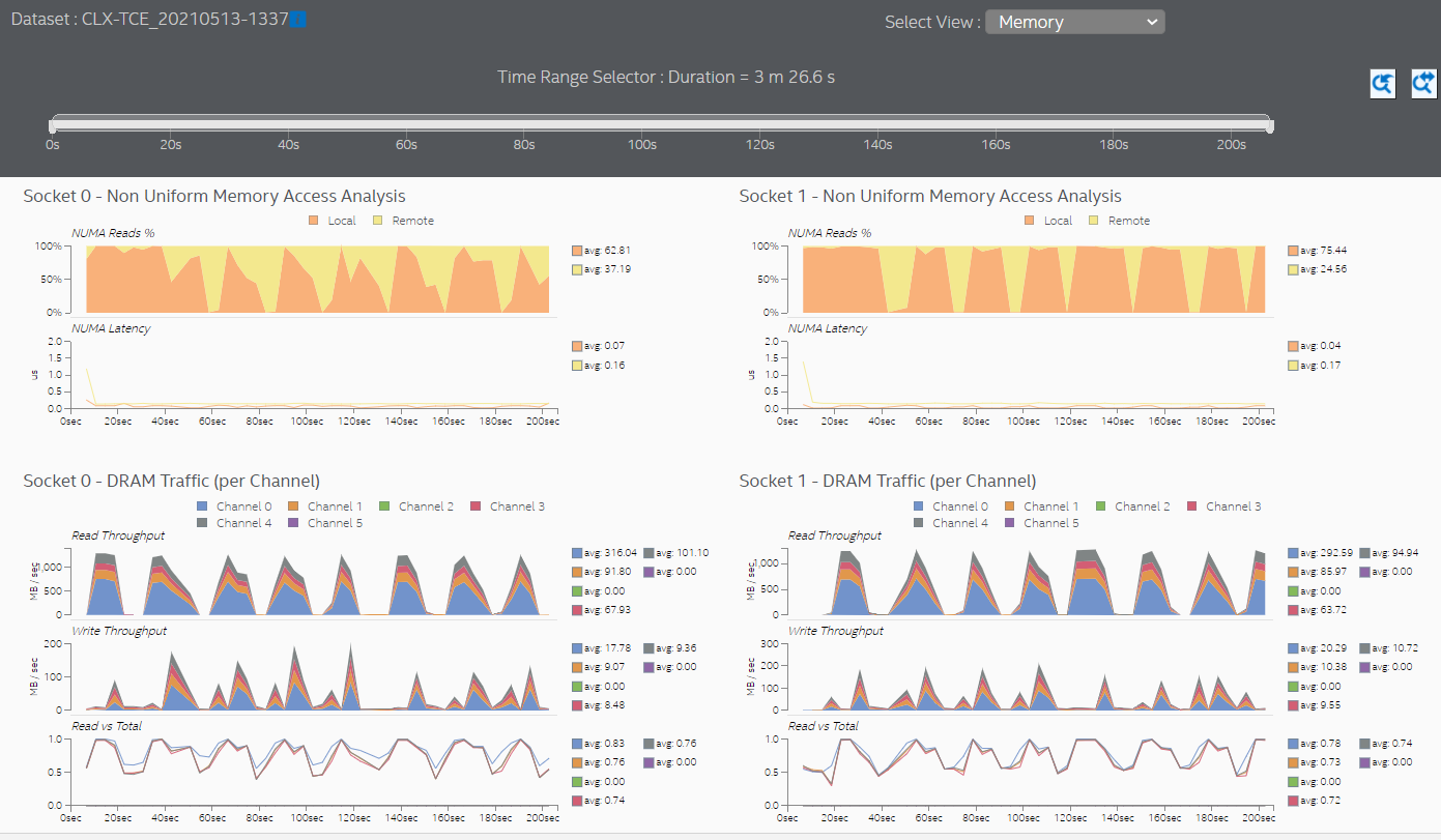 In the sample used here, the results show that almost all memory accesses are now local accesses. Most cross-socket traffic spikes were eliminated.