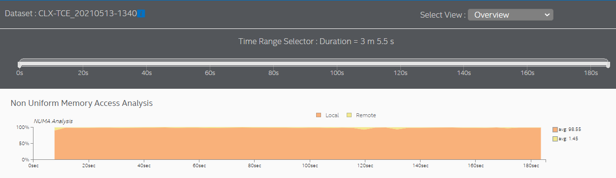 See the Non-Uniform Memory Access Analysis graph to compare local vs. remote memory accesses over time. A high percentage of remote accesses indicates a NUMA related performance issue.
