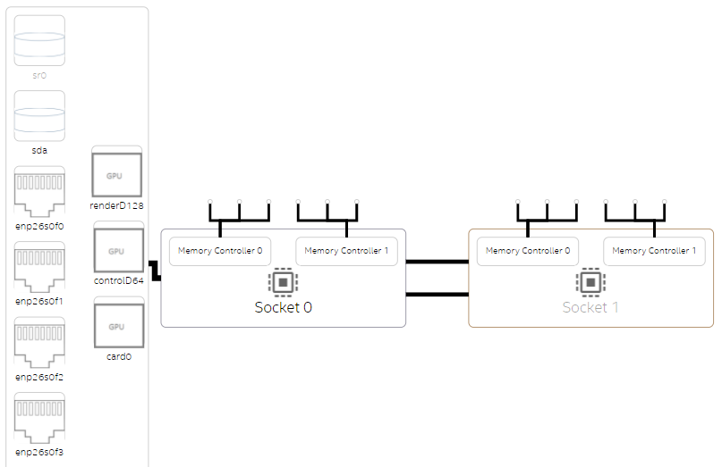 Start your analysis of NUMA issues by selecting Overview in the Select View pulldown menu. In the system configuration overview, you can see that a NUMA system typically has multiple processor sockets, each of which has memory controllers. This diagram is an example of a platform diagram for a two-socket system.
