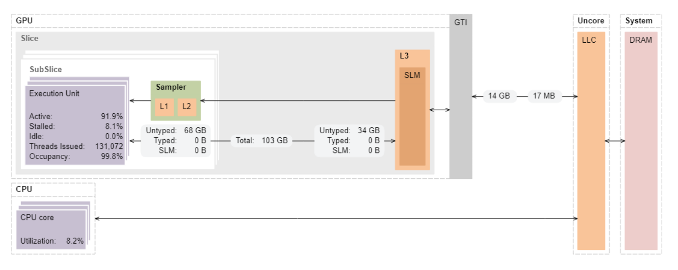 Notice the overall amount of data transferred to EUs (~68 GB) and data brought from LLC/DRAM through the GTI interface (14 GB).