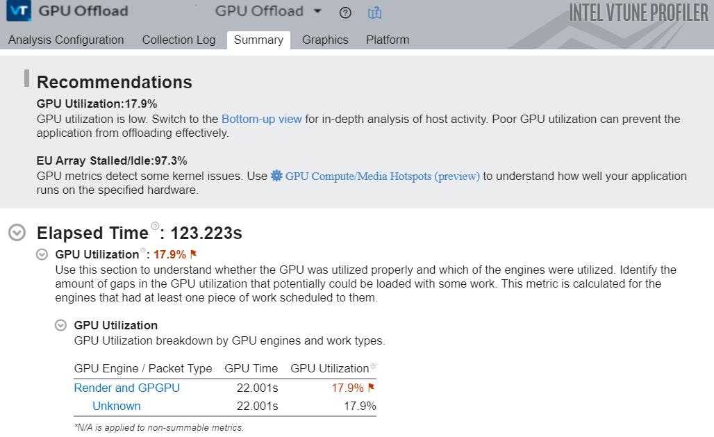 Use Intel® VTune™ Profiler to estimate overhead when offloading onto an Intel GPU. Analyze the performance of computing tasks offloaded onto the GPU.