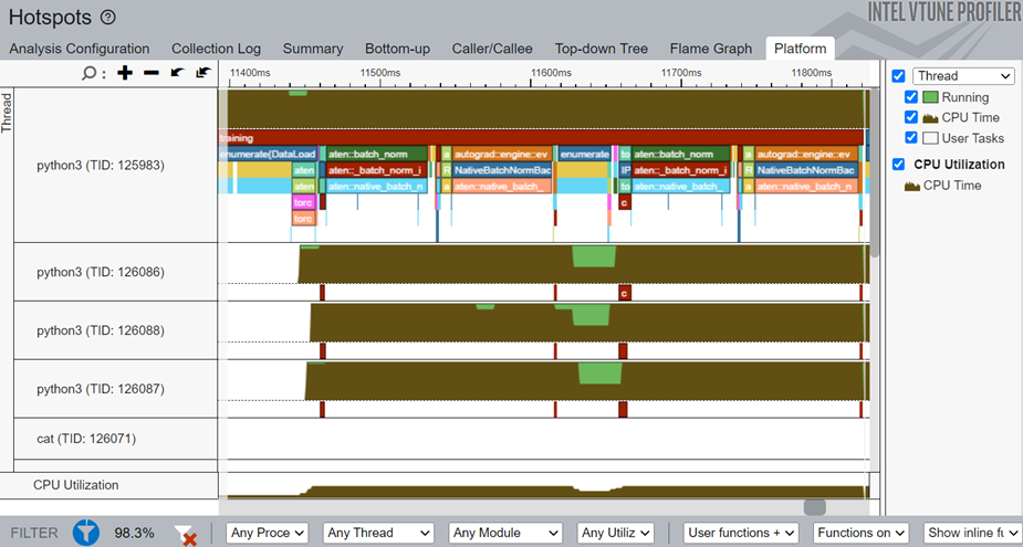 Switch to the Platform window to see the timeline for the training task, which was marked using PyTorch ITT APIs.
